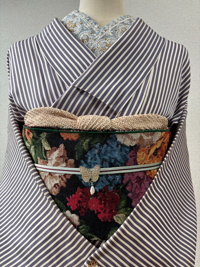 こちらは着物や浴衣に合わせる兵児帯です。 油彩画のようなお花が織られています。 色とりどりのポピー、大小様々なお花、華やかで暖かみのある帯ができました。 ゴブラン生地のしっかりとした密な織りと、油彩画のような重量感がマッチした素敵な兵児帯です。 秋はショールや羽織と合わせて、冬はニットのマフラーやウールのコートと合わせても素敵なコーデができそうです。 たっぷりと長さがあるので、リボン太鼓や華やかなアバニコ結びもできます。 全長約430㎝×30㎝です。 こちらは夏をのぞいたスリーシーズンお使いいただけます。 【購入の際の注意点】 ・ハンドメイドになります。 ・初期不良をのぞき、到着後のお客様都合の返品、交換はお受けできません。 ご了承ください。 ・和裁士の資格は持っておりません。ロックミシンで制作しています。 ・帯端の巻きロックから少し糸が飛び出ますが、不良品ではありません。 ・画面上と実物のお色味が違って見える場合があります。 ※爪や帯留などにひっかけないようご注意ください。 ・お洗濯も可能です。 ・お洗濯は優しく手で押すように手早く洗ってください。 使用後は陰干しして乾かした後、アイロンをかけて収納してください。 ・洗濯機で洗う場合はおしゃれ着洗いコースで脱水を1.2分でお願いいたします。 必ずネットに入れてください。 ・アイロンは当て布をしてからあててください。 お洗濯後は軽く叩くように伸ばして干していただければ大体の形は戻ります。 ・色落ち・色移りする場合があります。ご注意ください。 ・配送中のトラブルの責任は負いかねます。