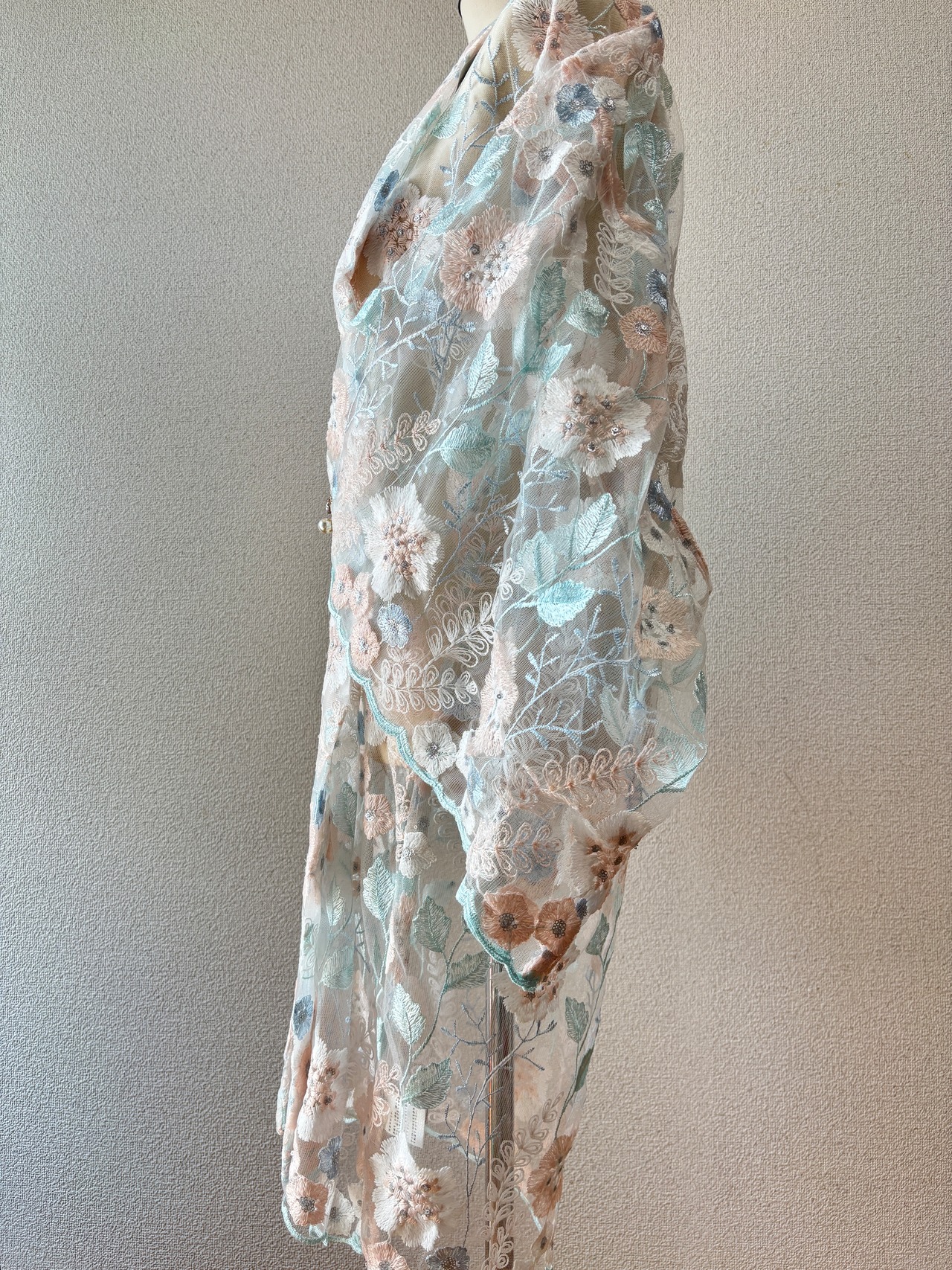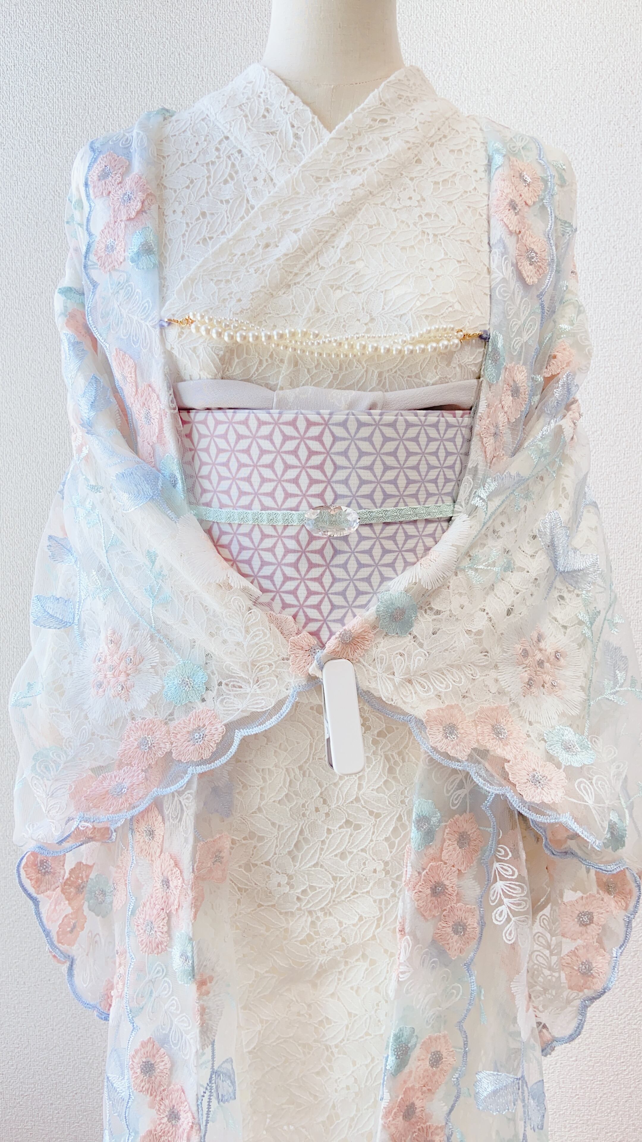 下に着るお着物の色によって、目立つ刺繍の色が変わって面白いです。