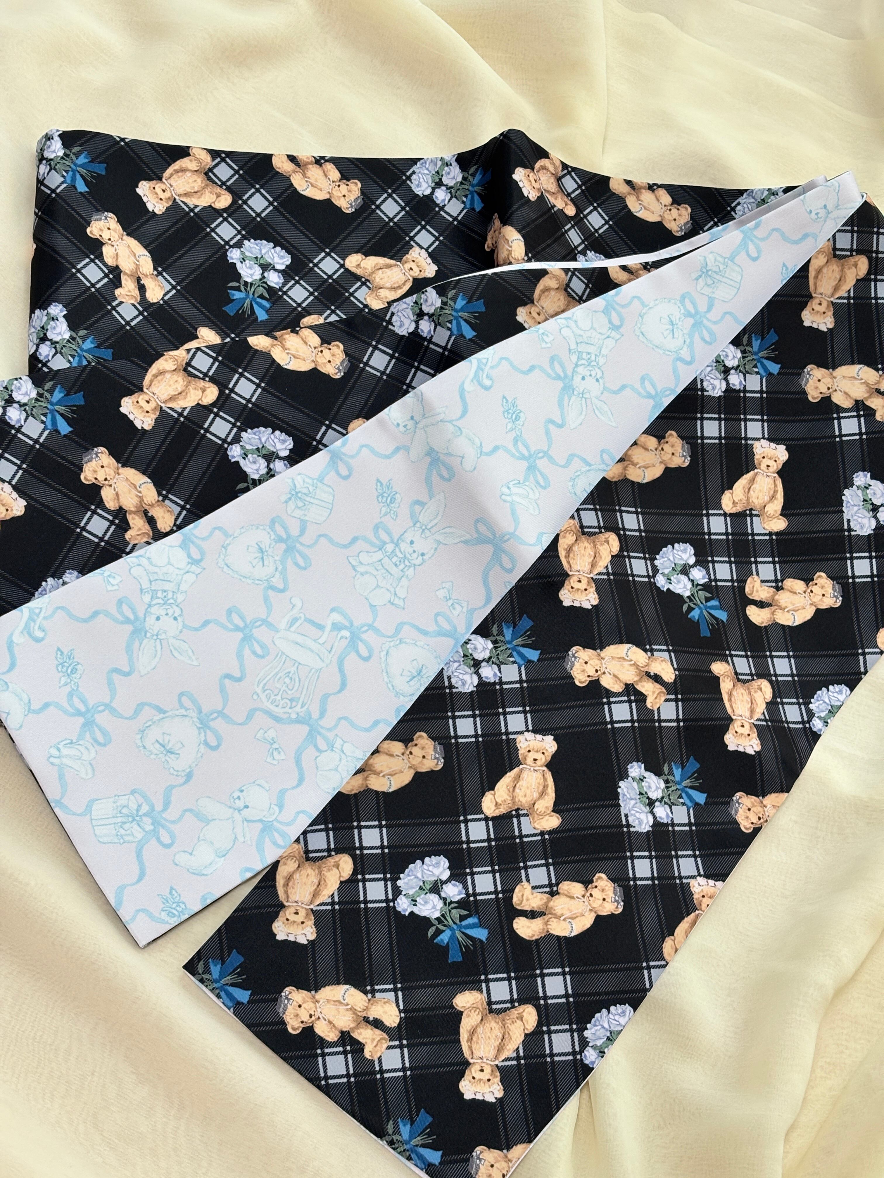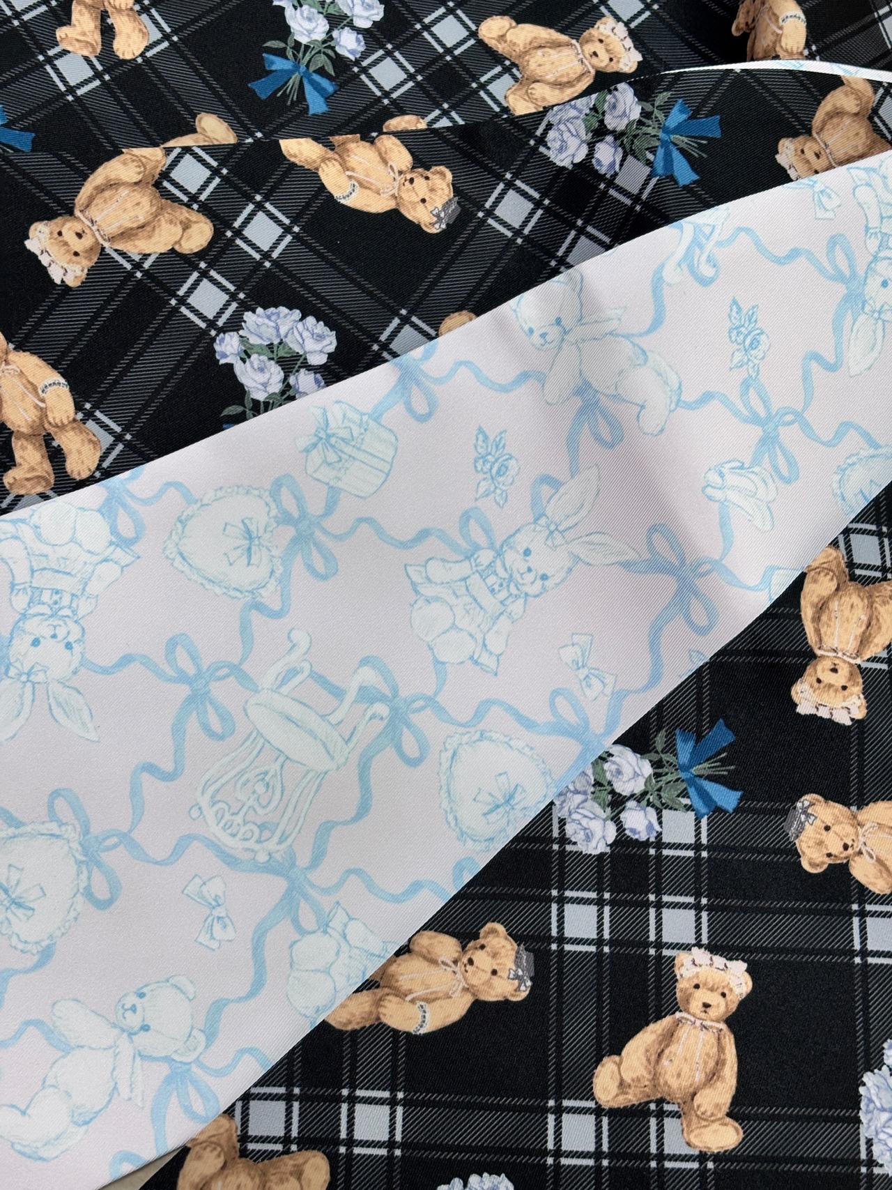 リボンや帽子、レースでおめかししたくまちゃんが、タータンチェック模様に描かれています。青っぽいグレーの薔薇にくすみブルーのリボンが巻かれたブーケもあり、往年のロリータワンピースの柄を彷彿とさせます。