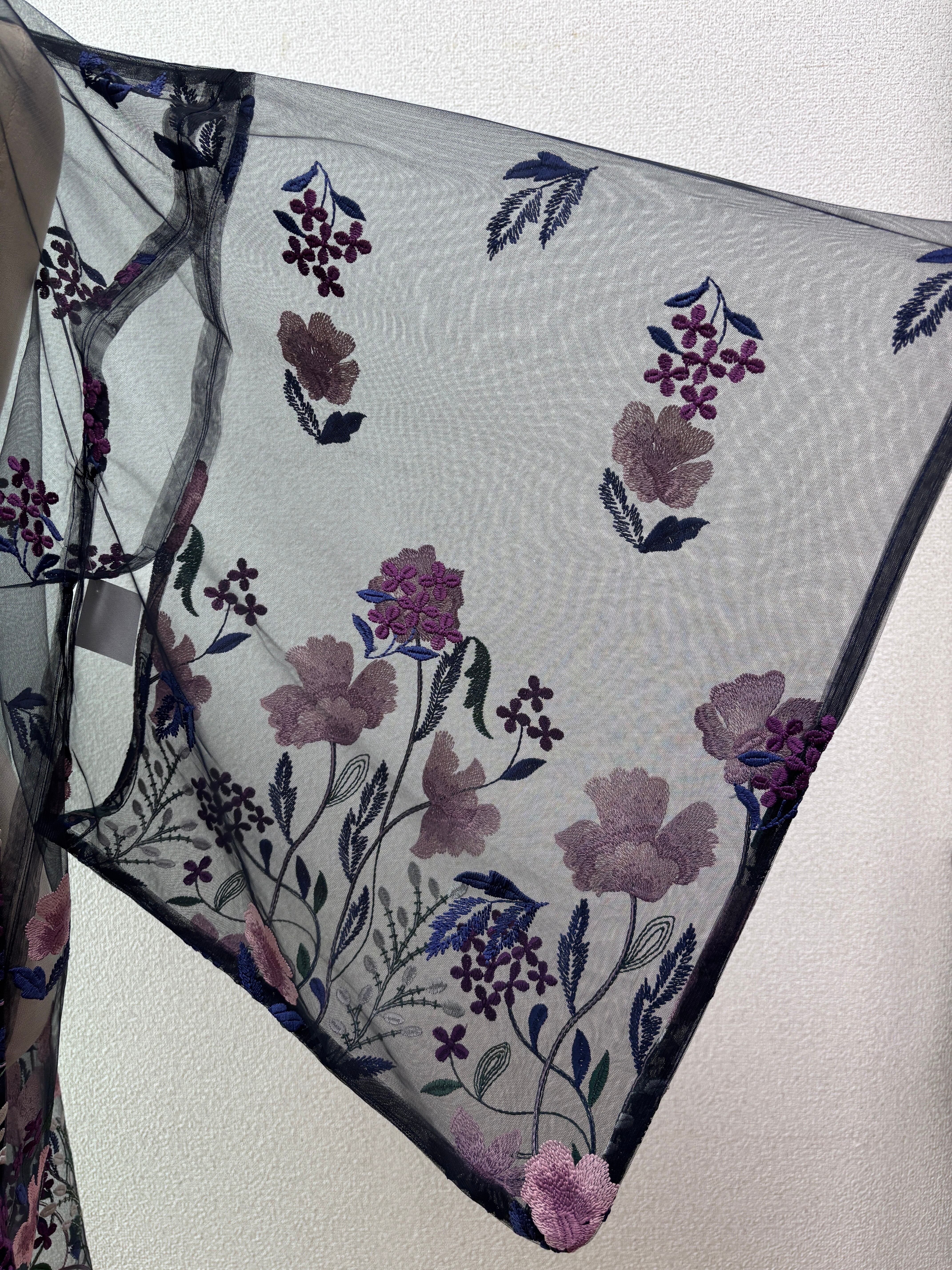 日本の工場で作られたチュール生地は、色とりどりの植物がみっしりと刺繍されています。