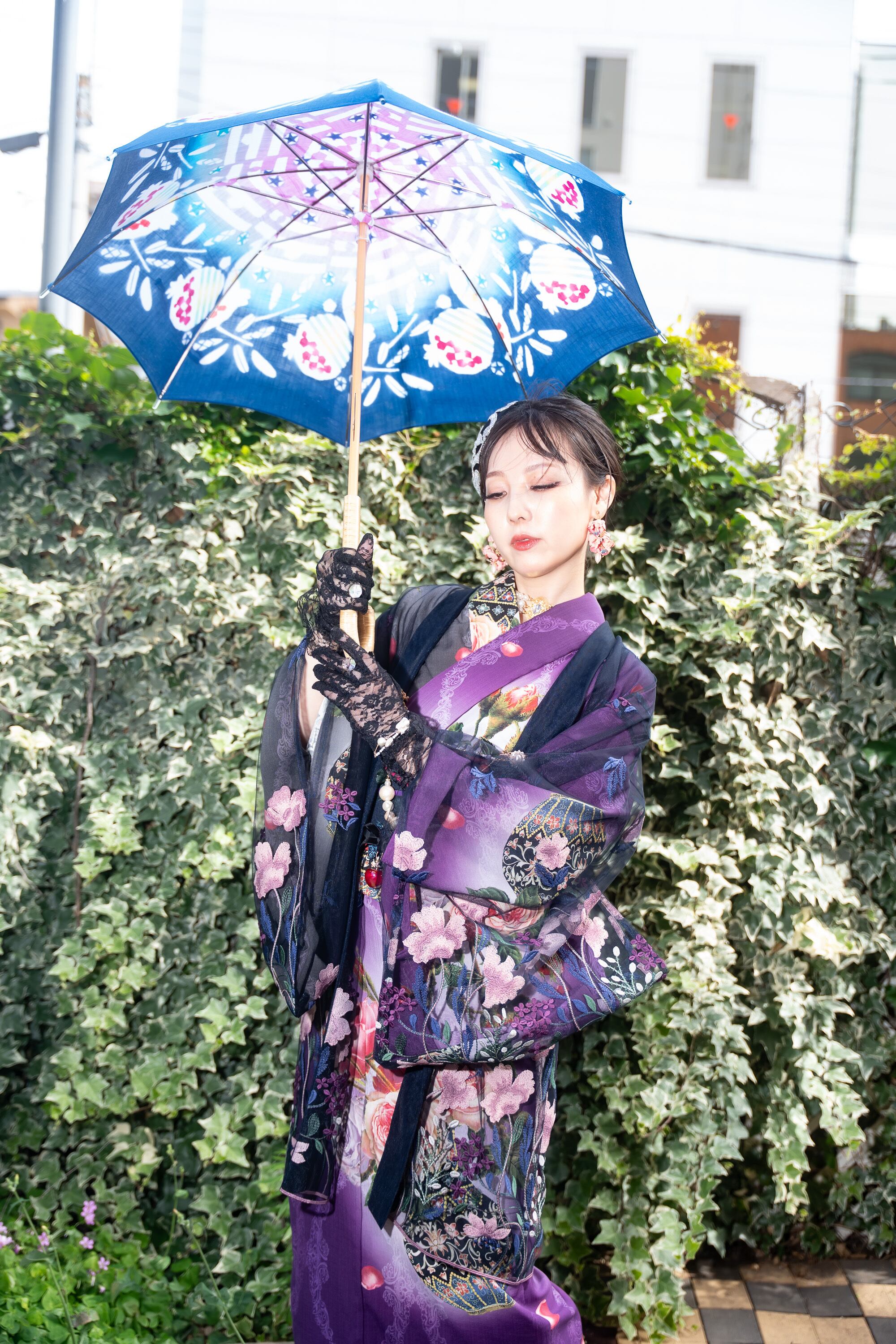 下に着るお着物の色によって、目立つ刺繍の色が変わって面白いです。