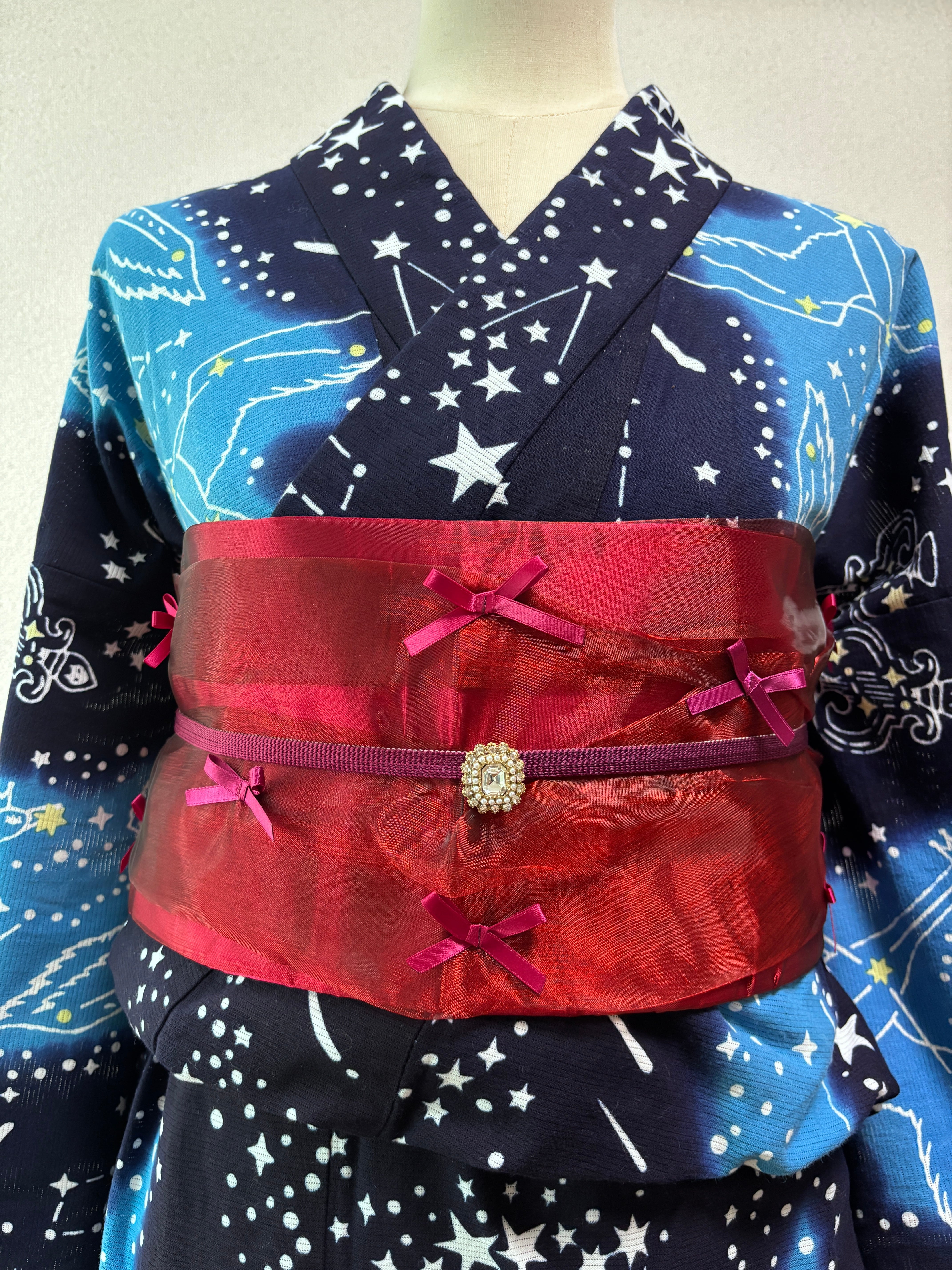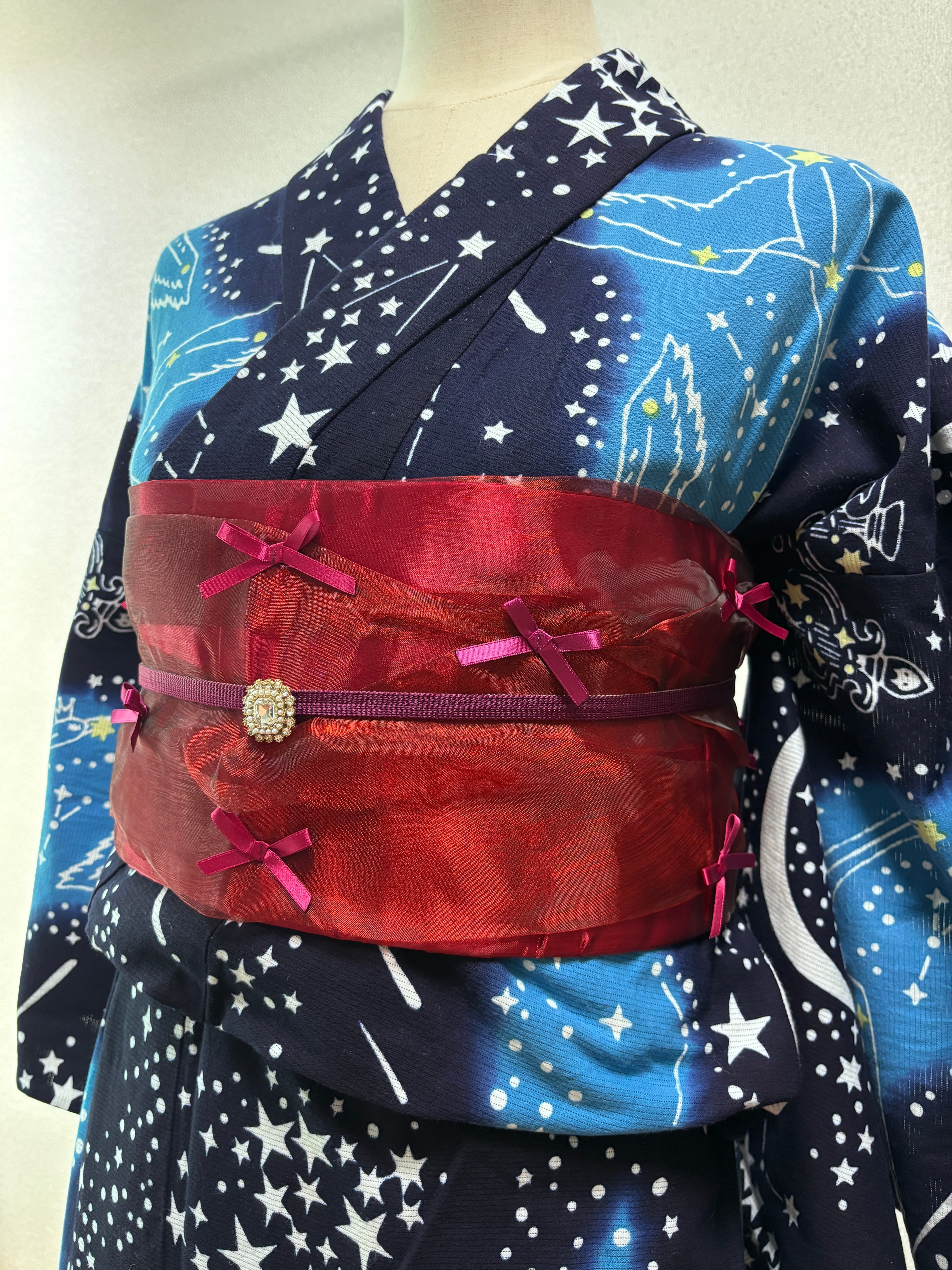 前帯部分にはリボンを一つ一つ縫い付けております。