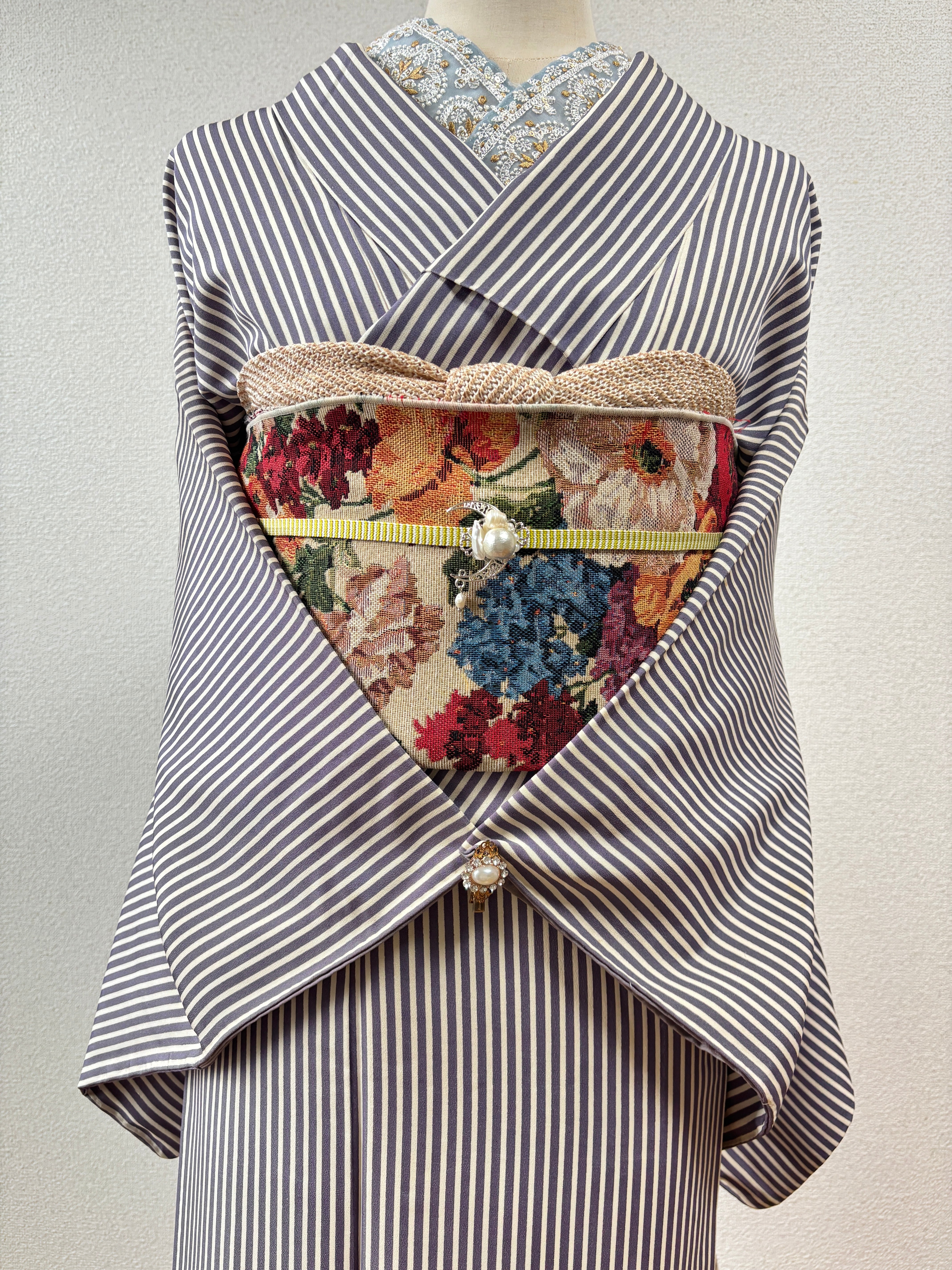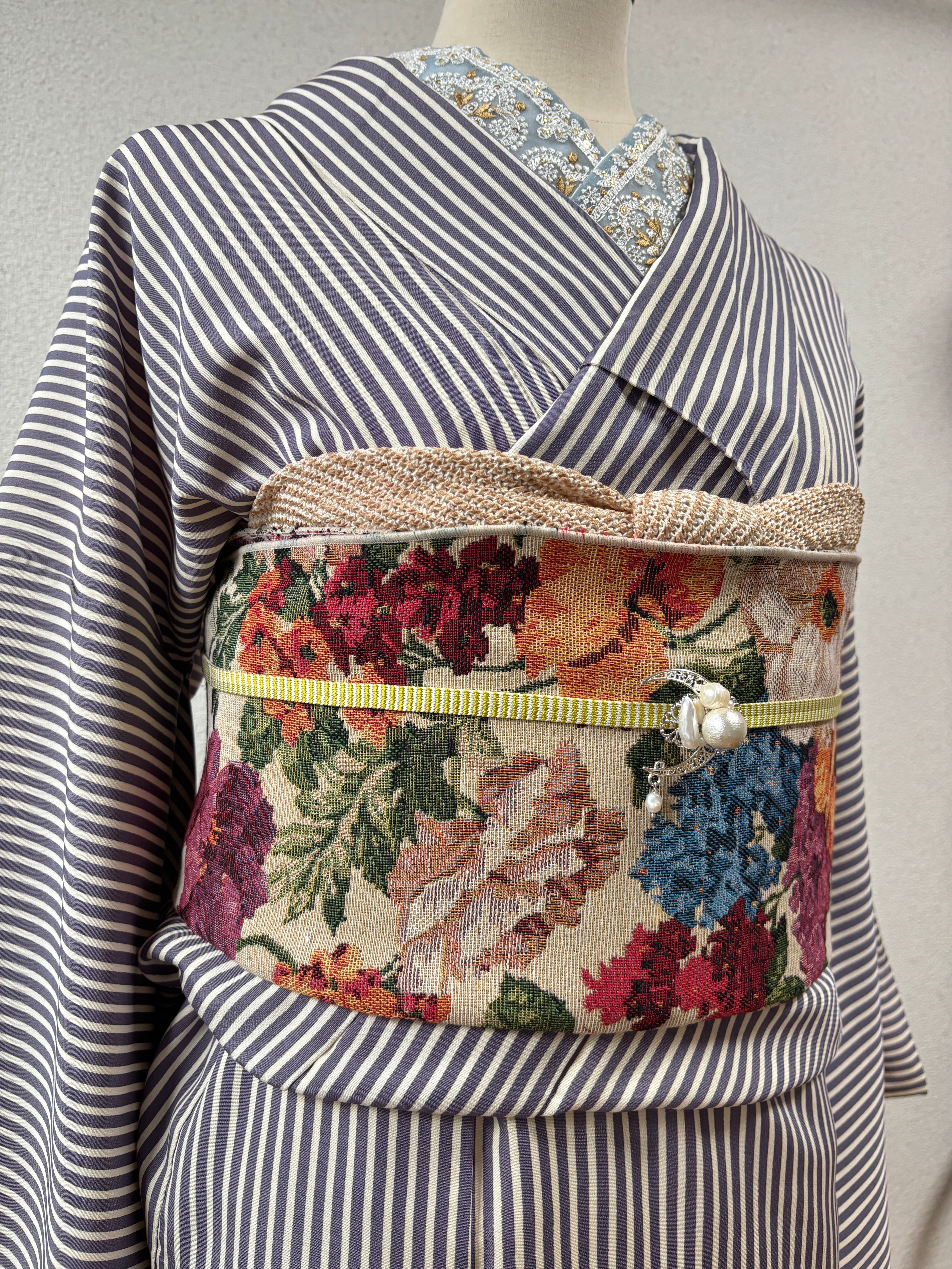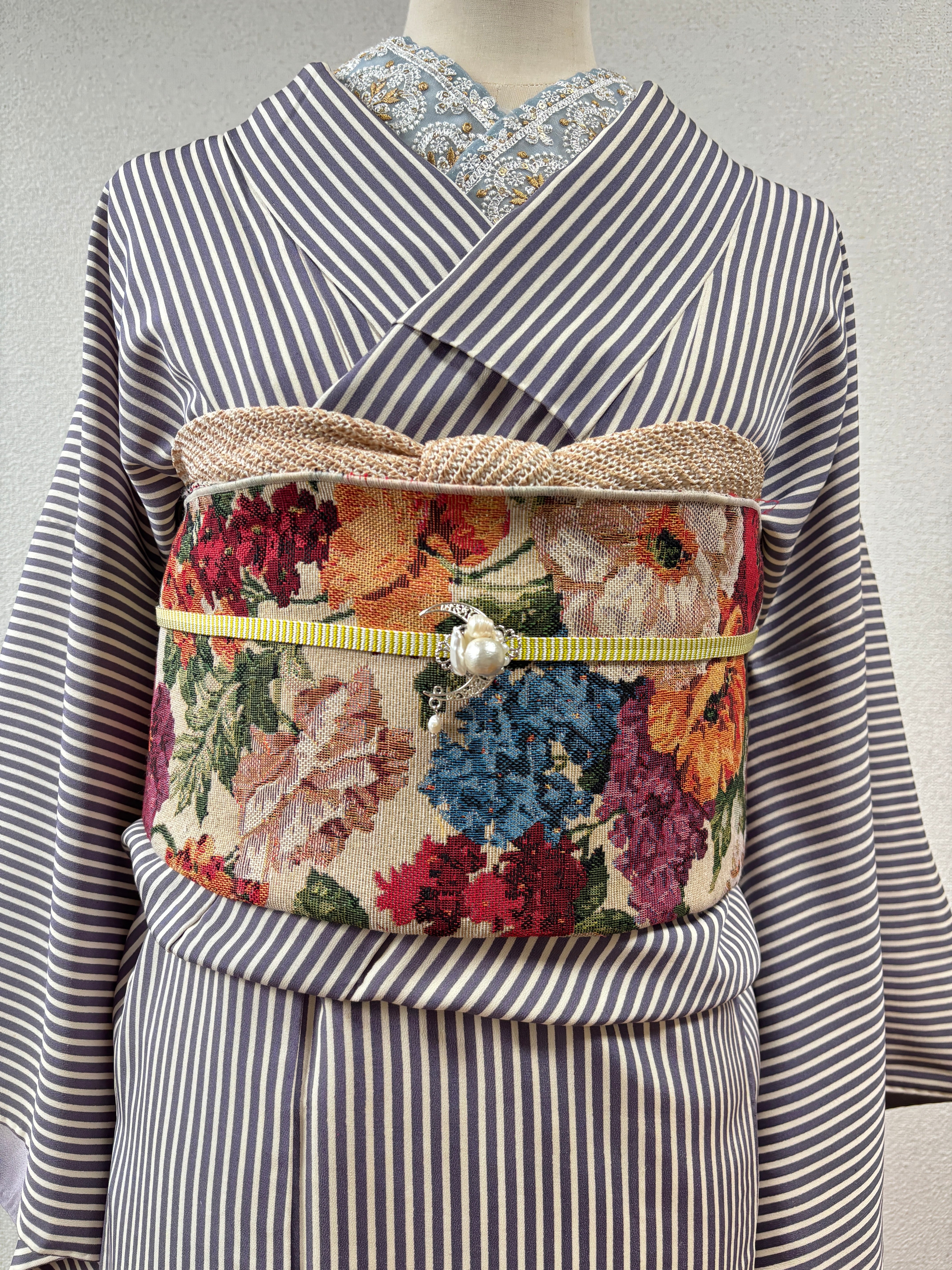ゴブラン生地のしっかりとした密な織りと、油彩画のような重量感がマッチした素敵な兵児帯です。