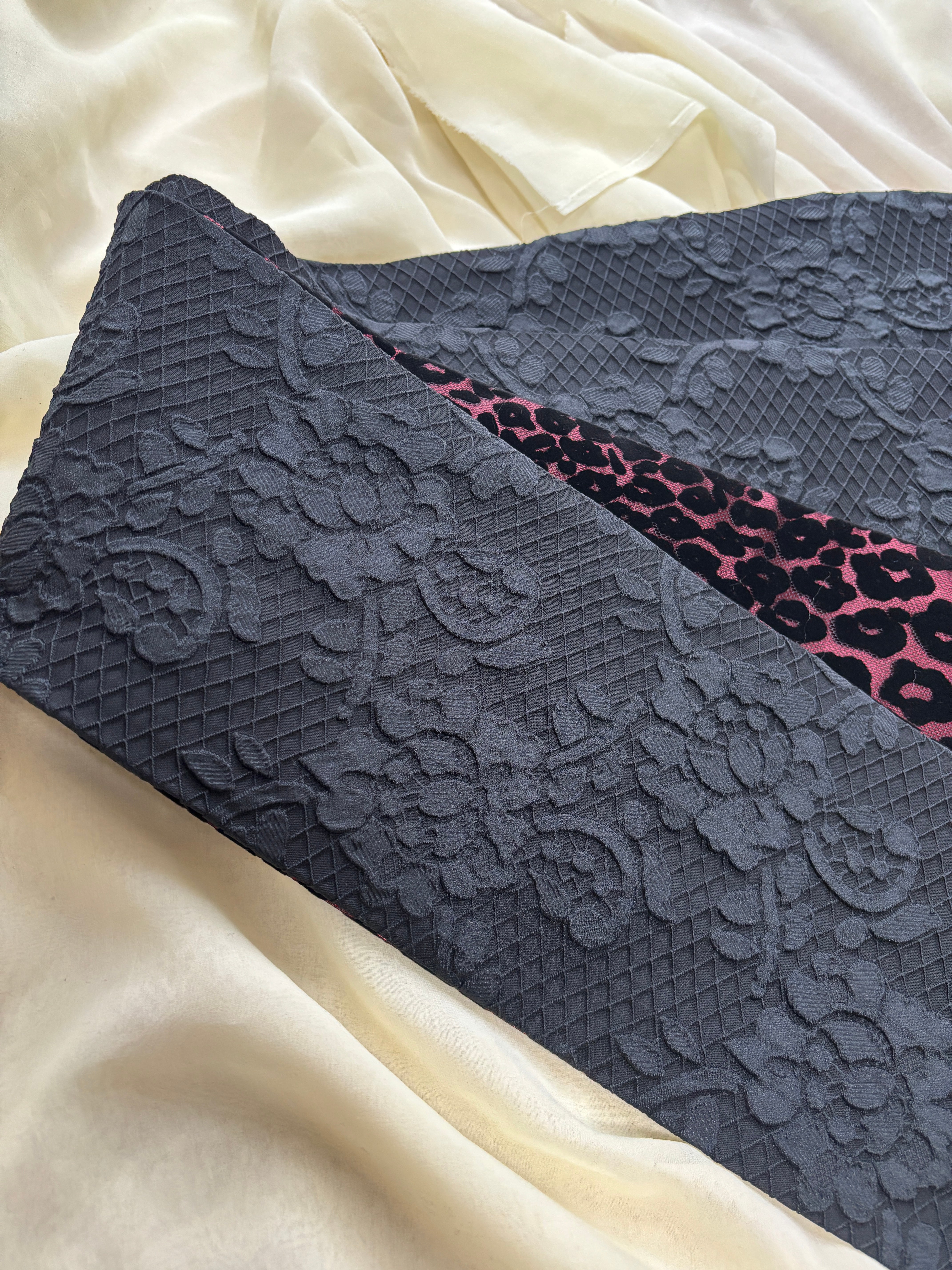 片面はフロッキーベロアのレオパードチュール、もう片面は膨れジャガード生地を使いました。