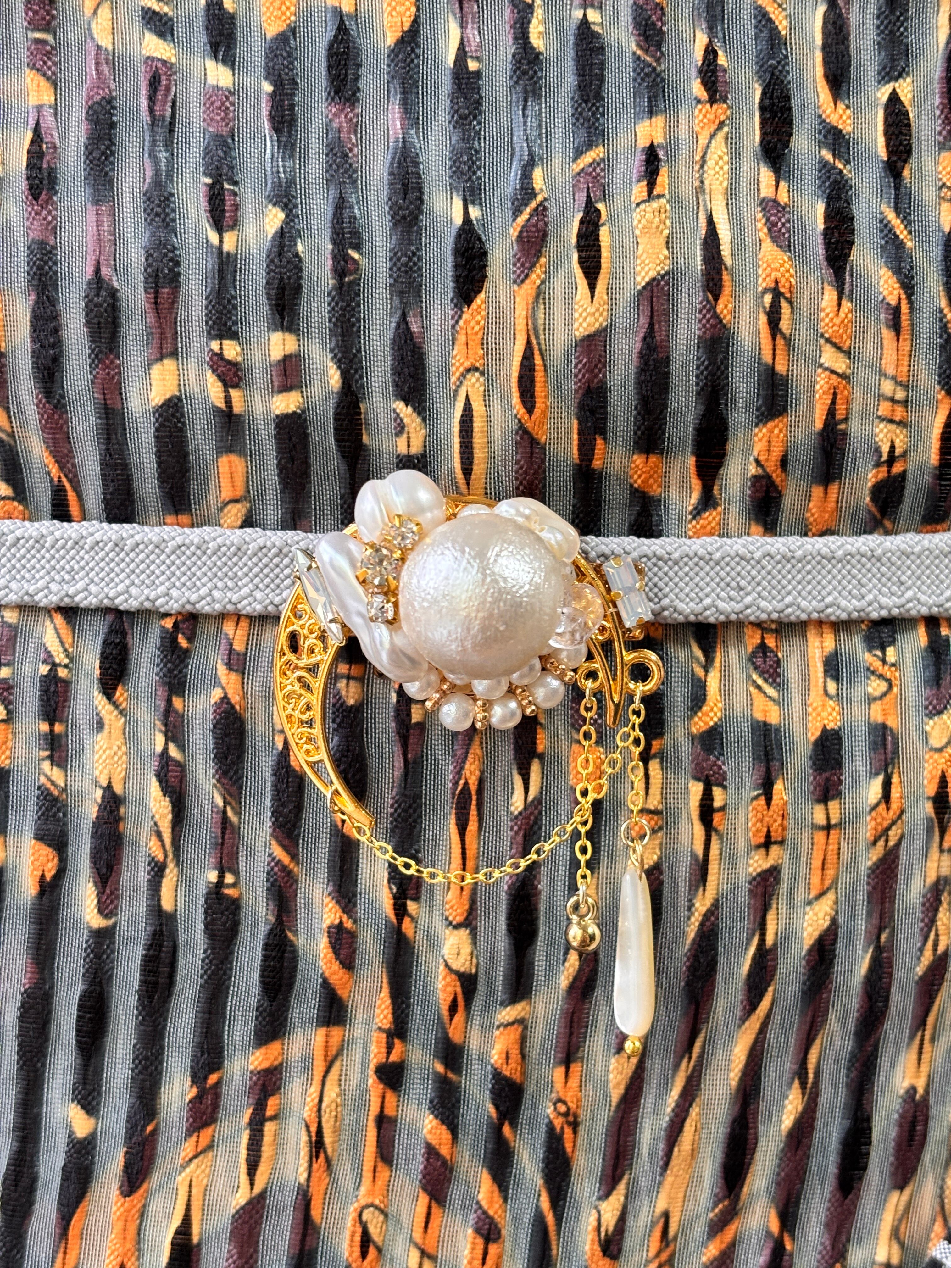 この帯留は、ひとつひとつ手作りしているため、製品ごとに微妙な違いが生じることがありますが、それも手作りならではの味わいとしてお楽しみいただけたら幸いです。