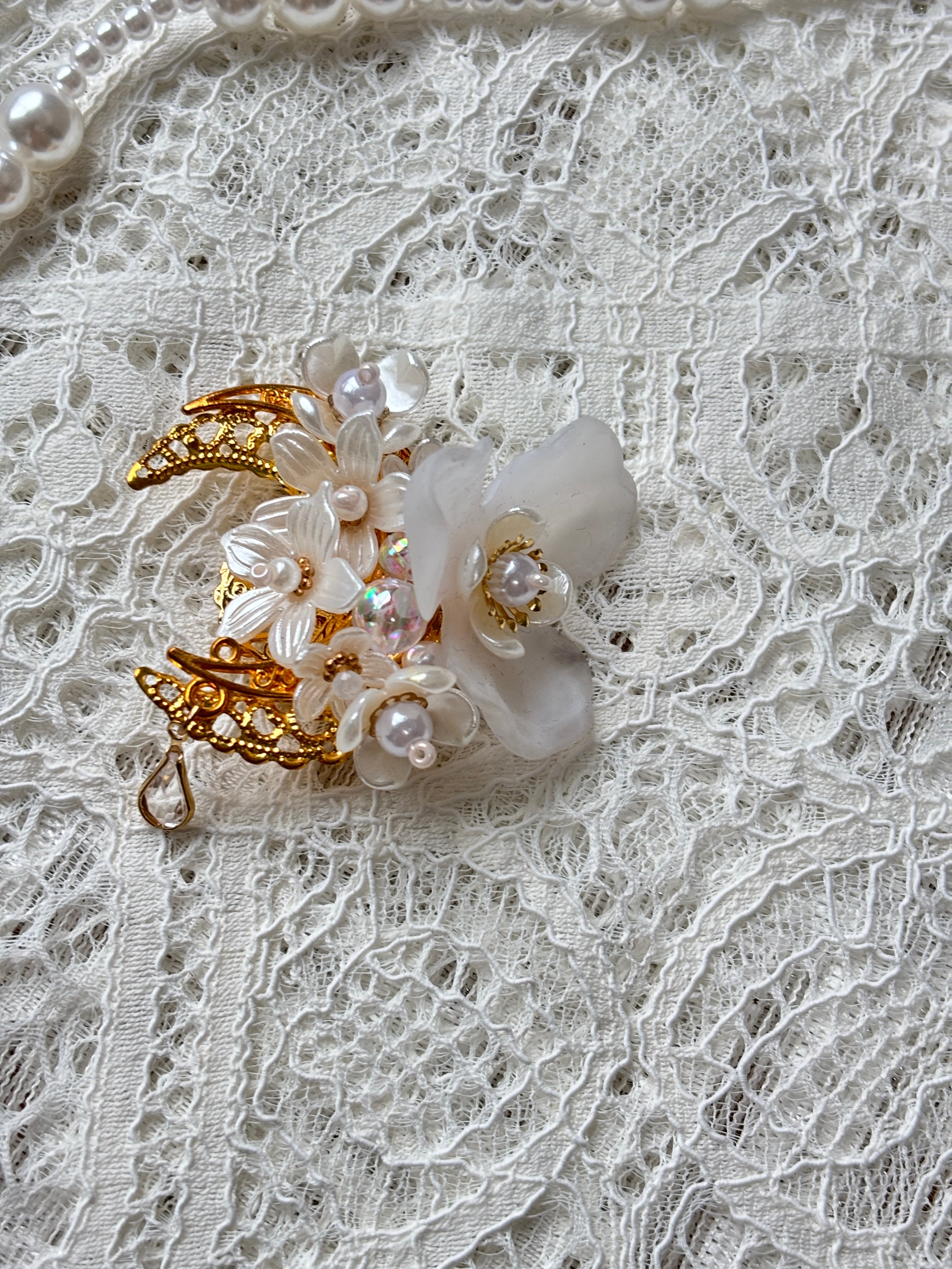 大きな白い花と三日月のモチーフが絶妙に組み合わさったデザインは、重厚感と華やかさを兼ね備えています。