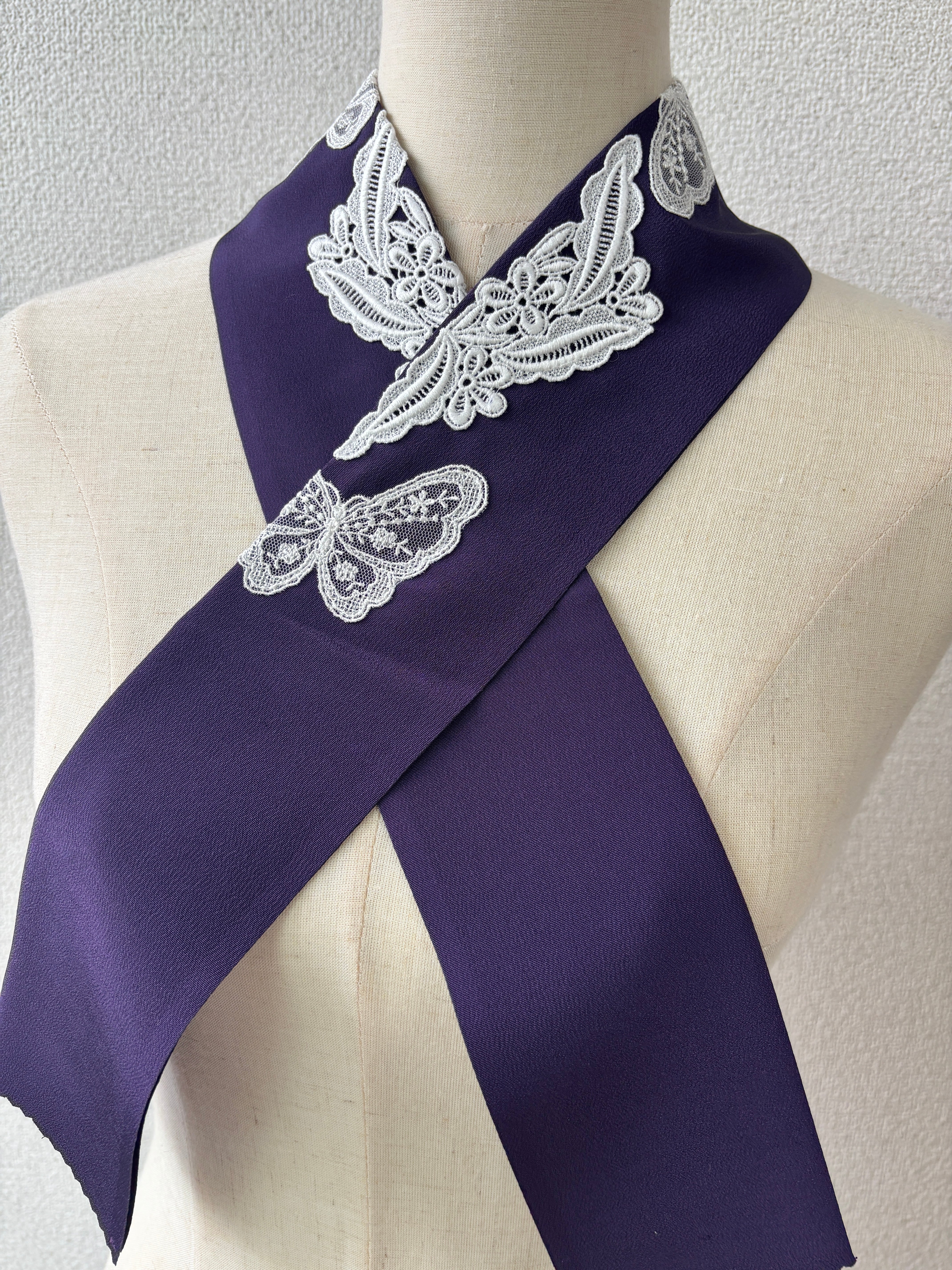 紫色に白のレースを合わせた半衿は、可愛らしいコーデからモダンなコーデまで幅広くお楽しみいただけます。