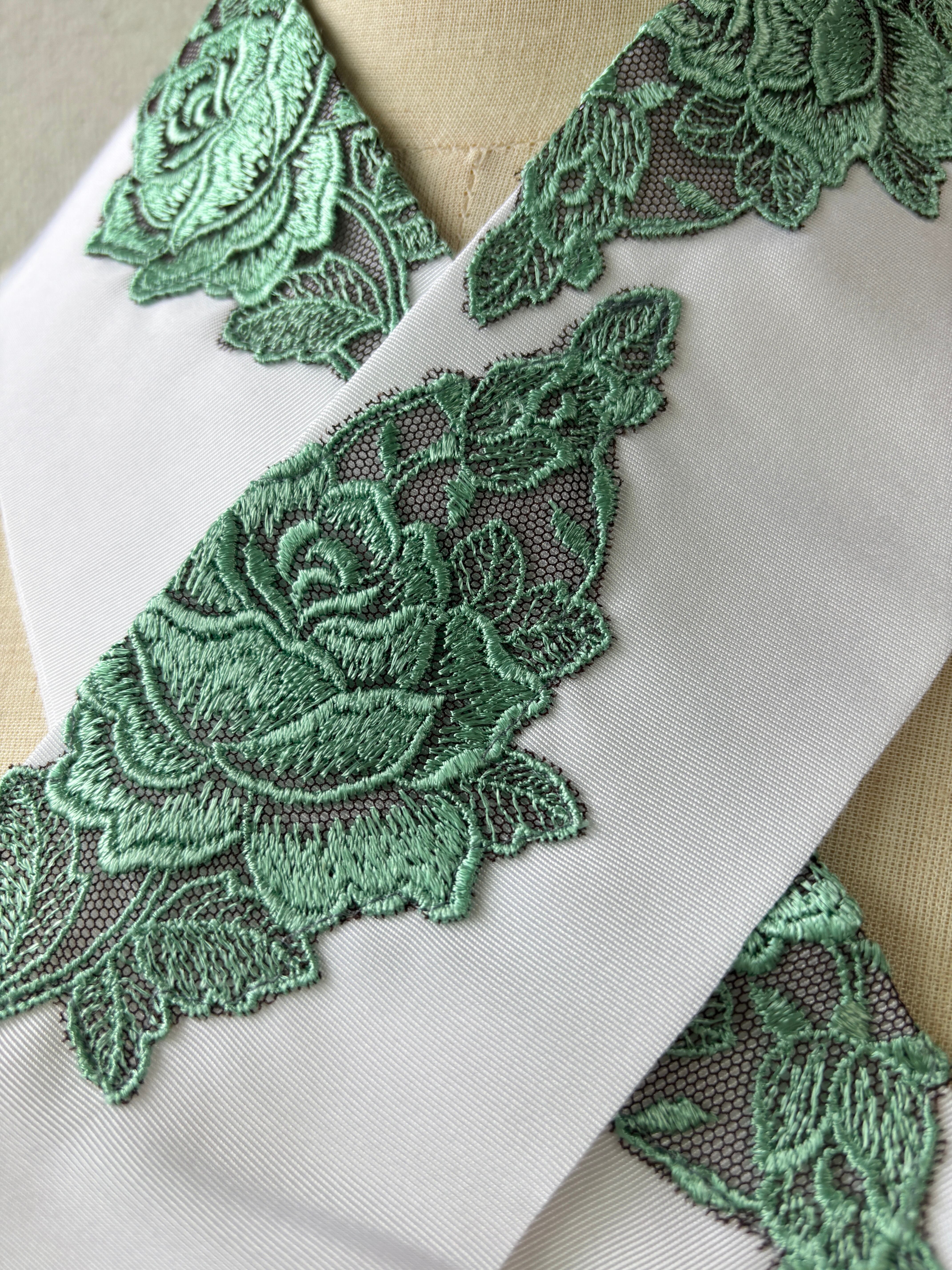 ポリエステルの塩瀬生地に、写実的な薔薇のコットンレースを縫い付けています。