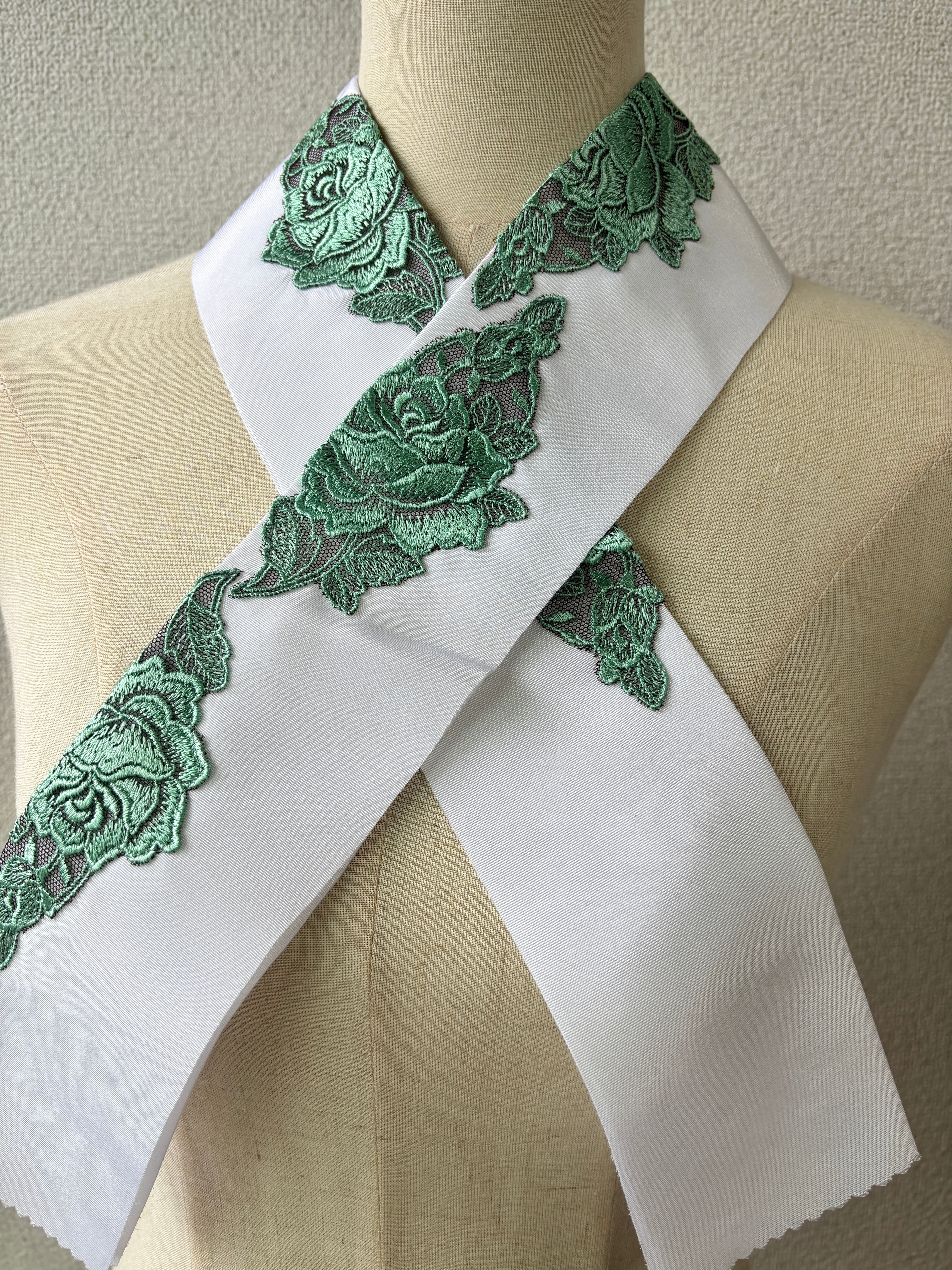 こちらは白地に薔薇のレースを付けた半衿です。