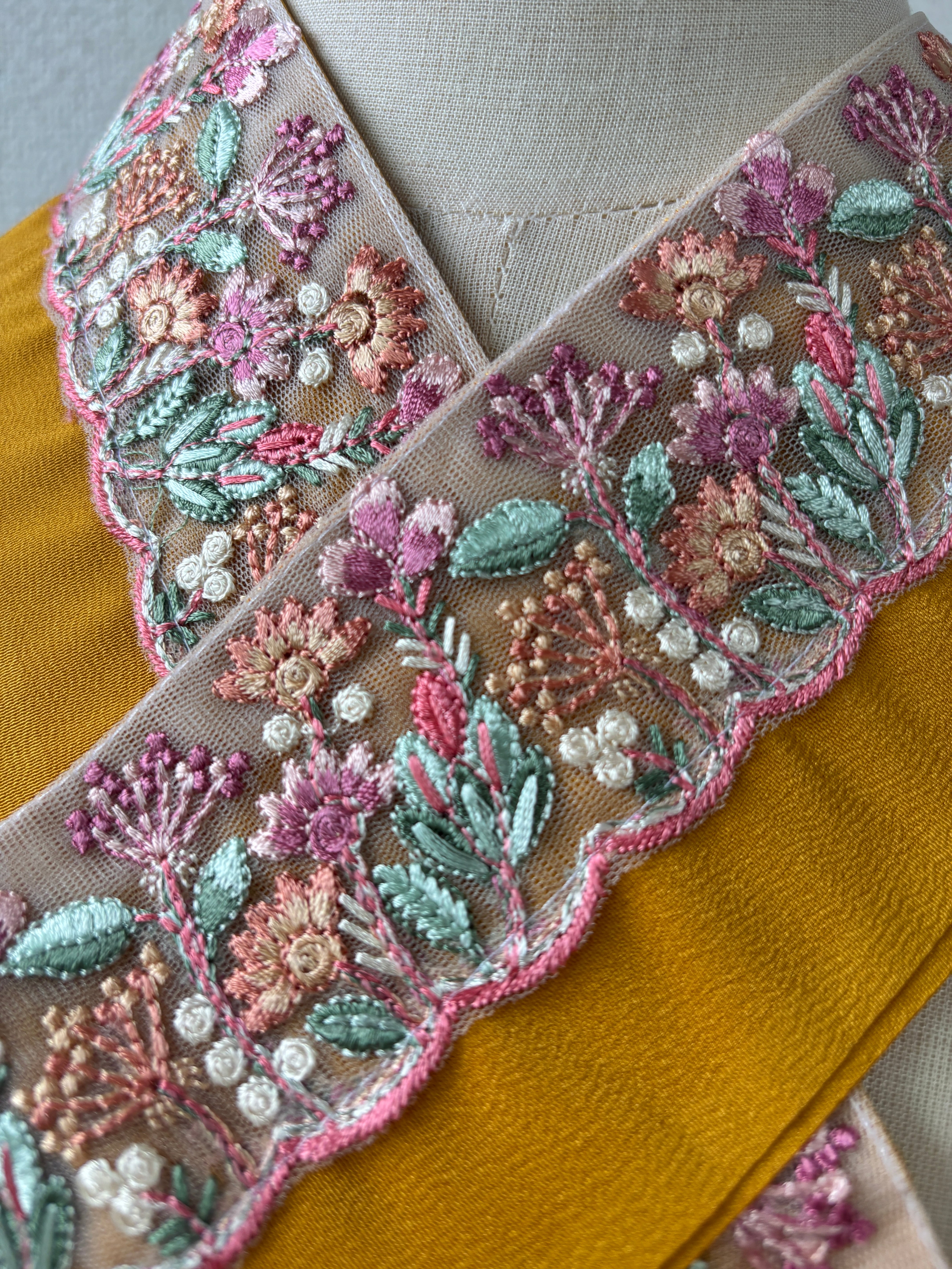 辛子色の生地に洋花の刺繍リボンを合わせました。
