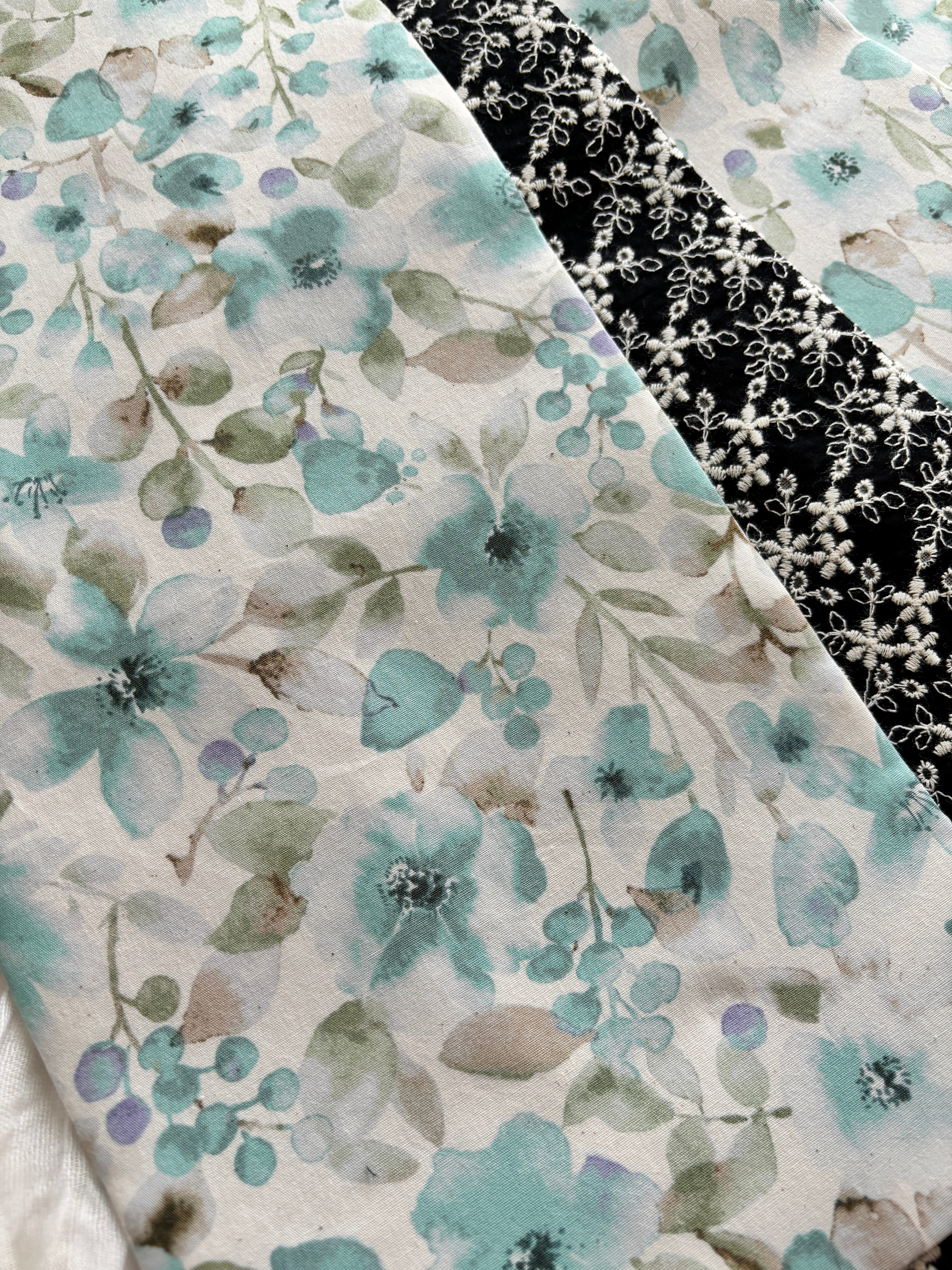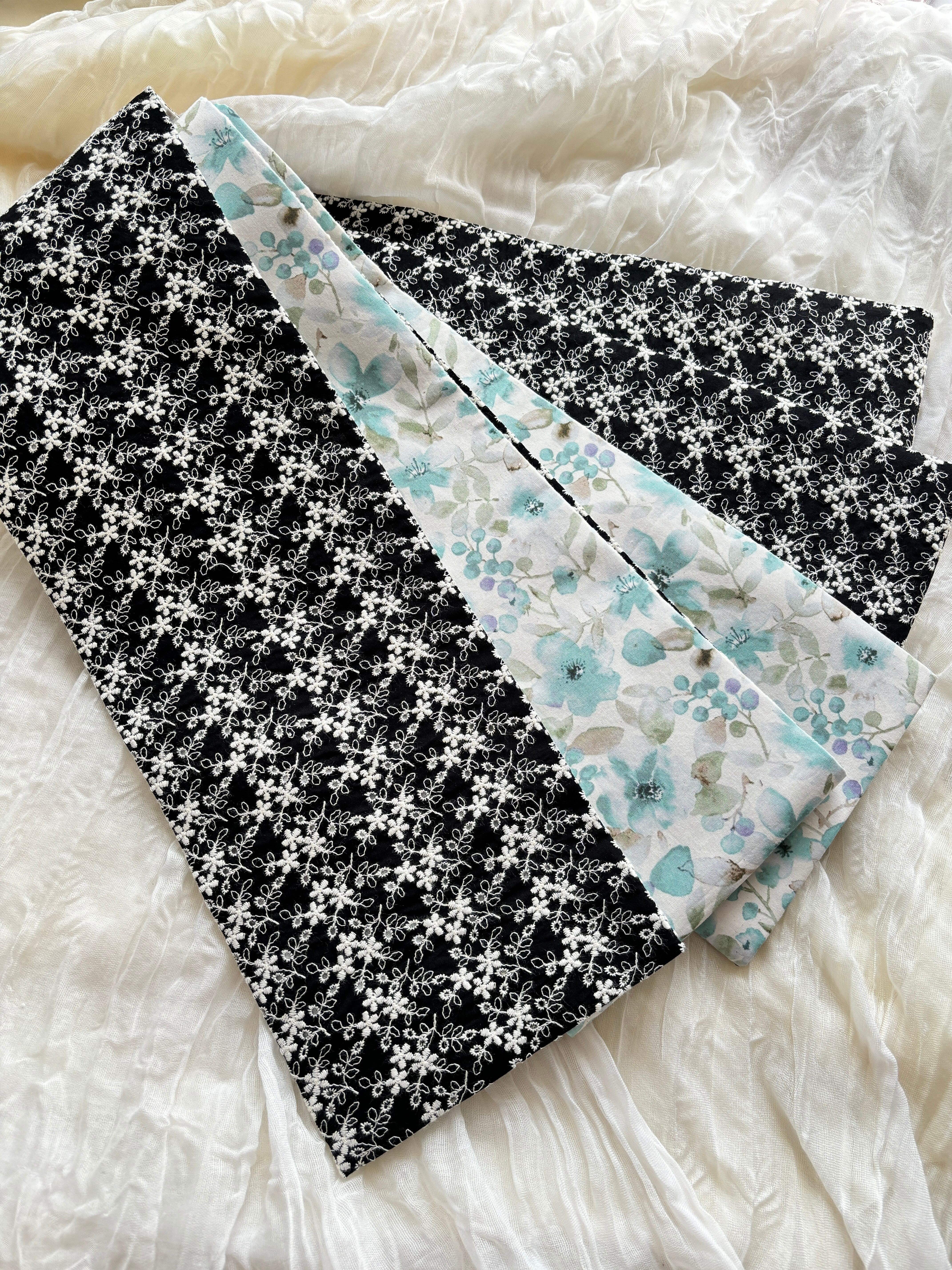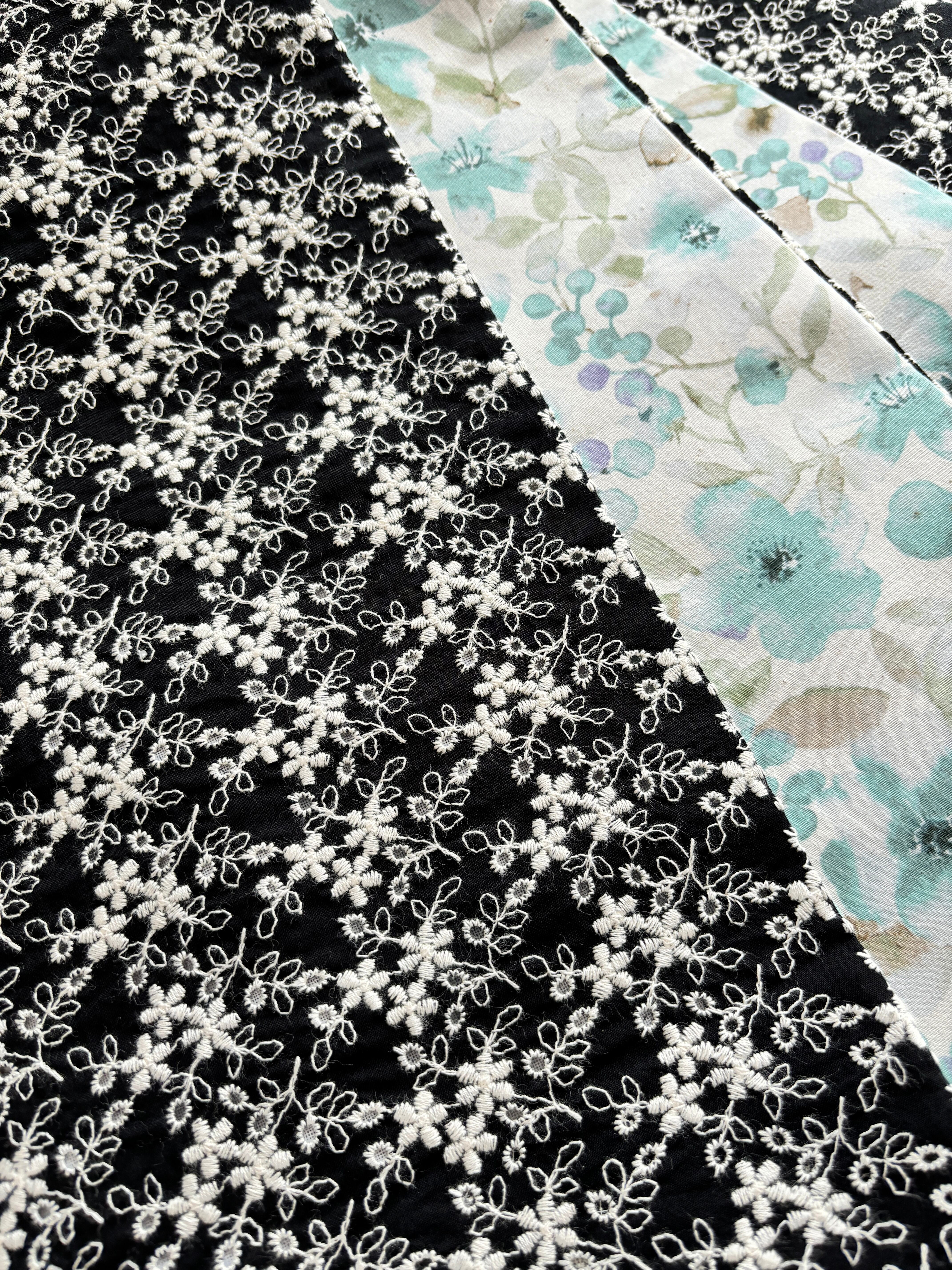 片面はボタニカルの水彩画風、もう片面は黒地に白刺繡のコットンレース生地を使いました。